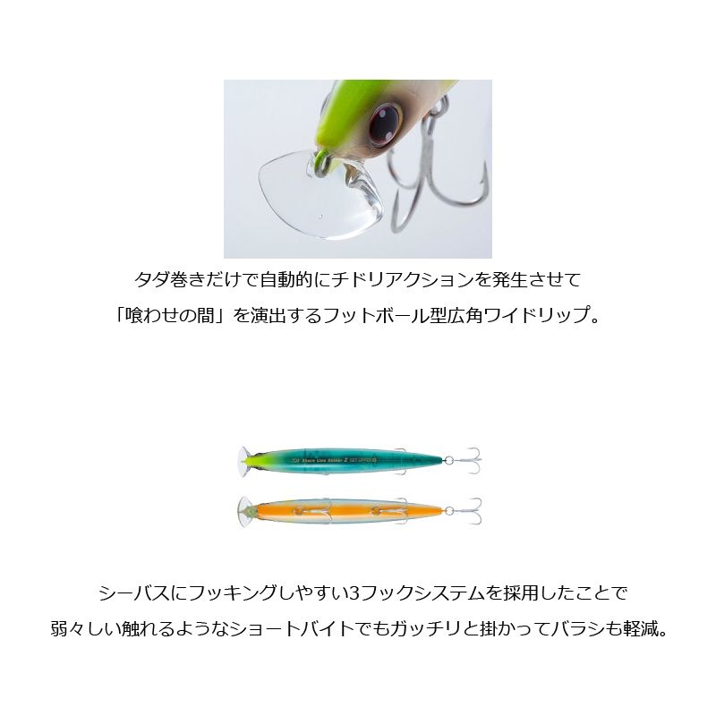 【仕様詳細】・タダ巻きだけで自動的にチドリアクションを発生させて「喰わせの間」を演出するフットボール型広角ワイドリップ。
