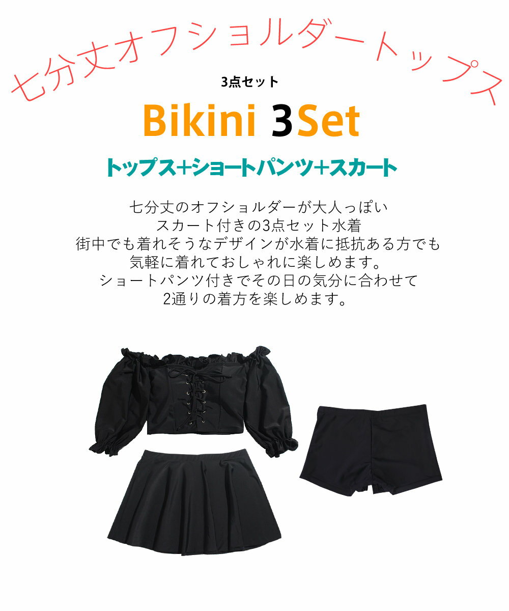 水着 レディース 体型カバー 3点セット ビキニ オフショルダー 大きいサイズ セクシー ブラック 無地 オトナ女子 M/L/LL